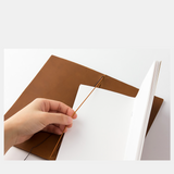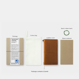 Traveler’s Notebook está compuesto de una cubierta hecha en cuero de Chiang Mai (Tailandia) y un refinado cuaderno de papel original de Designphil hecho en Japón. El cuaderno es de un tamaño similar al A5, excepto que de ancho es más delgado, para que sea más fácil de llevar y que se adapte mejor a la hora de escribir. El kit permite insertar en su interior mapas, billetes y hojas de tamaño A4 en forma de tríptico. Se puede utilizar el cuaderno tal cual, pero añadiendo un estuche con cremallera, unos bolsillitos o un porta bolígrafos, aumenta su capacidad de almacenamiento. Si agregas una goma elástica de Traveler’s, puedes aumentar el número de recambios que van dentro del cuaderno.